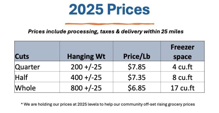 Quarters – mixture of Brisket, T-Bone/Porterhouse, Filet + NY Strip, Sirloin, Ribs, Chuck Steak, Delmonico Ribeye, Chuck Roast, Ground Beef, Flank, Eye Roast, Top/Bottom Round, Sirloin Tip, Shank, and Ground Beef